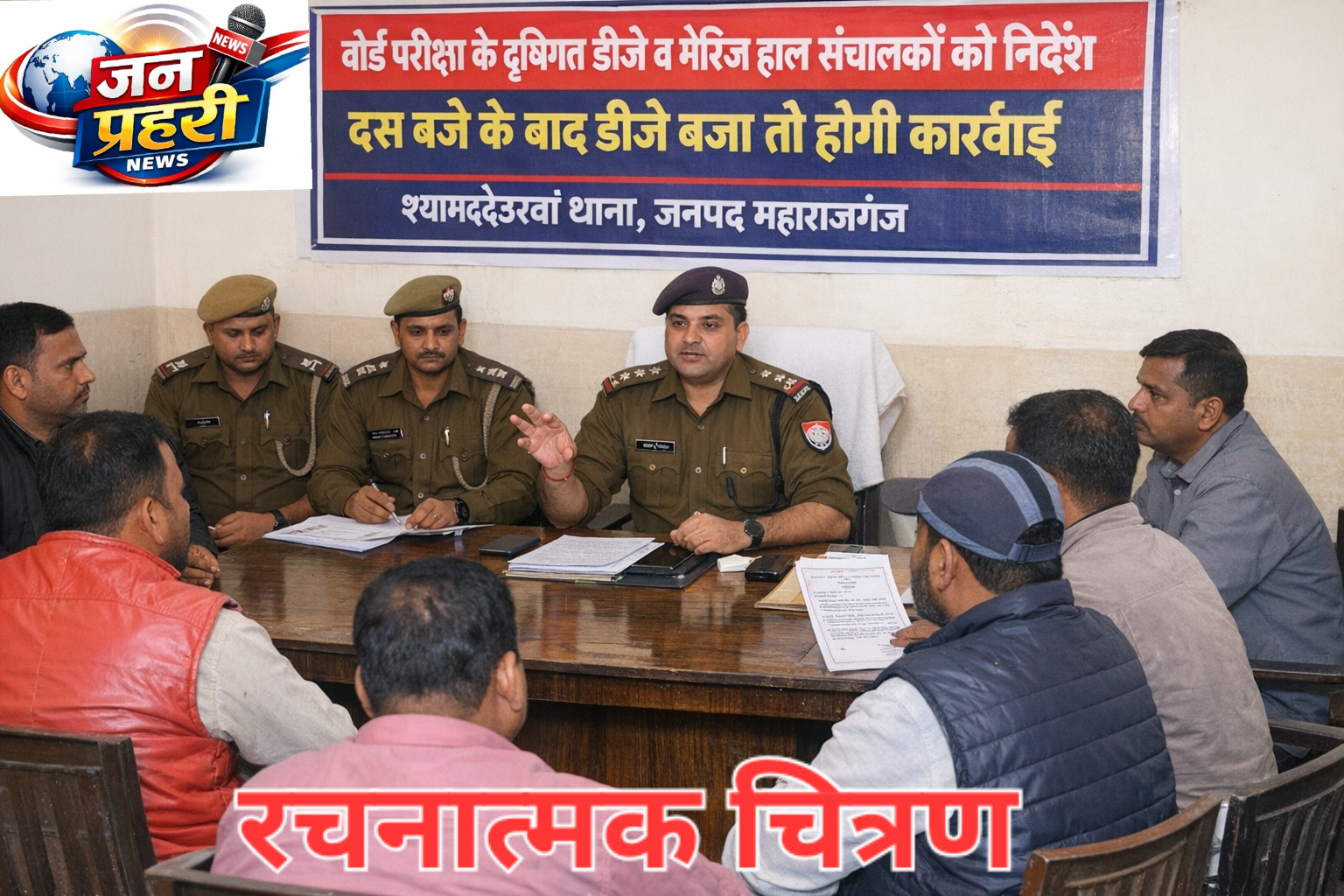 परतावल। वृहस्पतिवार को श्यामदेउरवां थाना परिसर में थानाध्यक्ष अभिषेक सिंह की अध्यक्षता में मैरिज हाल एवं डीजे संचालकों की बैठक आयोजित की गई। बैठक में बोर्ड परीक्षाओं के मद्देनज़र रात्रि 10 बजे के बाद डीजे न बजाने के सख्त निर्देश दिए गए।