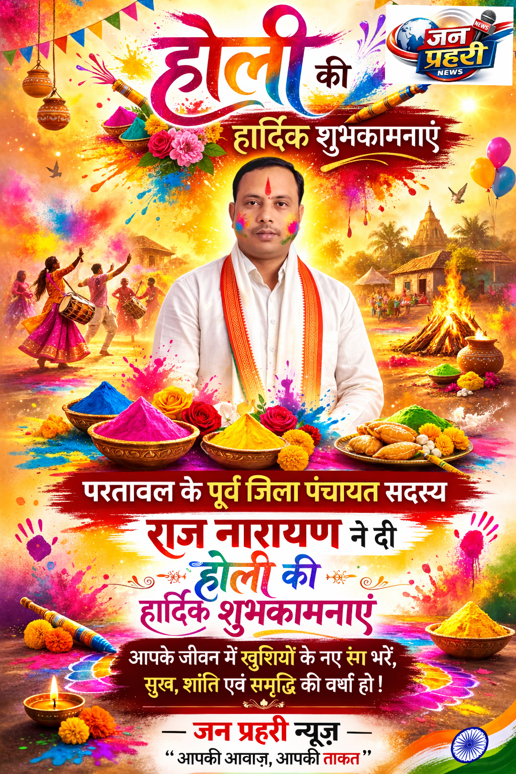 परतावल क्षेत्र के पूर्व जिला पंचायत सदस्य राज नारायण ने समस्त क्षेत्रवासियों को रंगों के पावन पर्व होली की हार्दिक बधाई एवं शुभकामनाएं दी हैं।