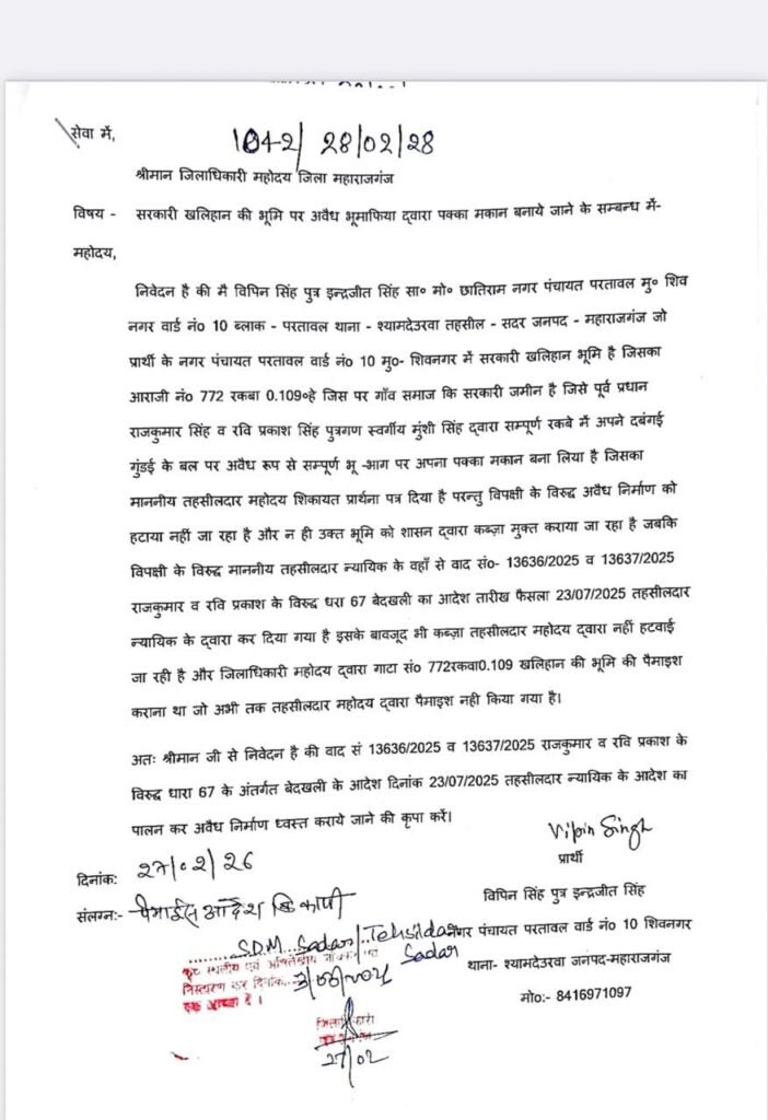 बताया गया कि नगर पंचायत परतावल वार्ड नंबर 10 शिवनगर स्थित आराजी संख्या 772, रकबा 0.109 हेक्टेयर (सरकारी खलिहान भूमि) पर कुछ लोगों द्वारा कब्जा कर पक्का मकान बना लिया गया है। शिकायत में आरोप लगाया गया कि कुछ लोगों द्वारा उक्त भूमि पर दबंगई के बल पर निर्माण कराया गया है।